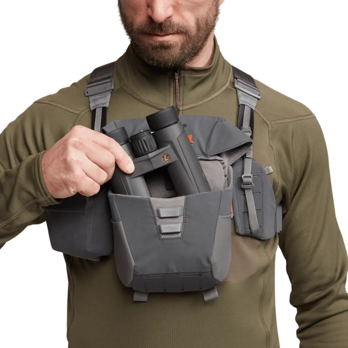 Magnetic top lids on both the binocular case and ambidextrous rangefinder pouch allow quiet, one-handed access to optics. The lids stow cleanly out of the way for enhanced visibility and efficiency.